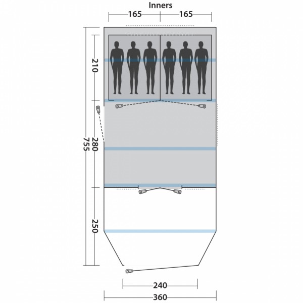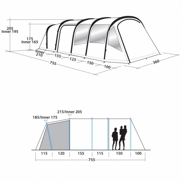 - Зовнішній тент (Д х Ш х В): 755 х 360 х 205 см
