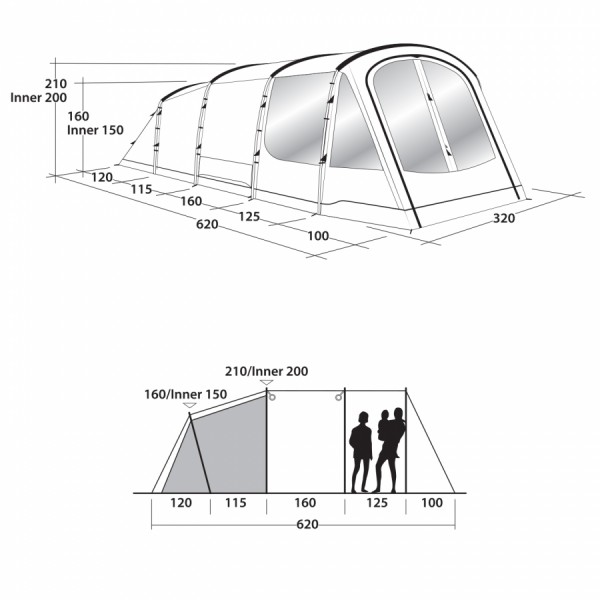 - Зовнішній тент (Д х Ш х В): 630 х 320 х 210 см