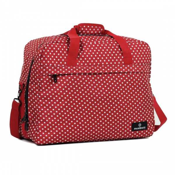 Колекція багажних сумок Essential On-Board розроблена відповідно до обмежень щодо провезення ручної поклажі, що висуваються найбільш популярними авіакомпаніями, що надають бюджетні перевезення (МАУ, WindRose, UTair та ін.). Компанія Members подбала, щоб усі необхідні та найцінніші речі завжди перебували з Вами під час польоту. Members Essential On-Board Travel Bag 40 Red Polka - класична сумка для транспортування необхідних речей в руках, на плечі або на телескопічній ручці основного багажу. Перевага даної моделі в тому, що її зовнішні розміри точно відповідають лімітам, що пред'являються популярними бюджетними авіакомпаніями до перевезення основної ручної поклажі на борту авіалайнера, а внутрішній простір при цьому дозволяє вмістити чималу кількість речей. При цьому простий дизайн сприяє зручності використання цієї моделі як універсальної сумки на кожен день.