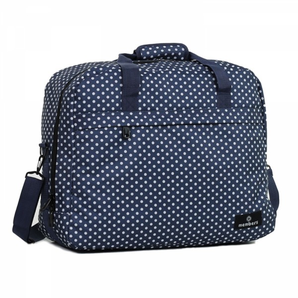 Колекція багажних сумок Essential On-Board розроблена відповідно до обмежень щодо провезення ручної поклажі, що висуваються найбільш популярними авіакомпаніями, що надають бюджетні перевезення (МАУ, WindRose, UTair та ін.). Компанія Members подбала, щоб усі необхідні та найцінніші речі завжди перебували з Вами під час польоту. Members Essential On-Board Travel Bag 40 Navy Polka - класична сумка для транспортування необхідних речей в руках, на плечі або на телескопічній ручці основного багажу. Перевага даної моделі в тому, що її зовнішні розміри точно відповідають лімітам, що пред'являються популярними бюджетними авіакомпаніями до перевезення основної ручної поклажі на борту авіалайнера, а внутрішній простір при цьому дозволяє вмістити чималу кількість речей. При цьому простий дизайн сприяє зручності використання цієї моделі як універсальної сумки на кожен день.