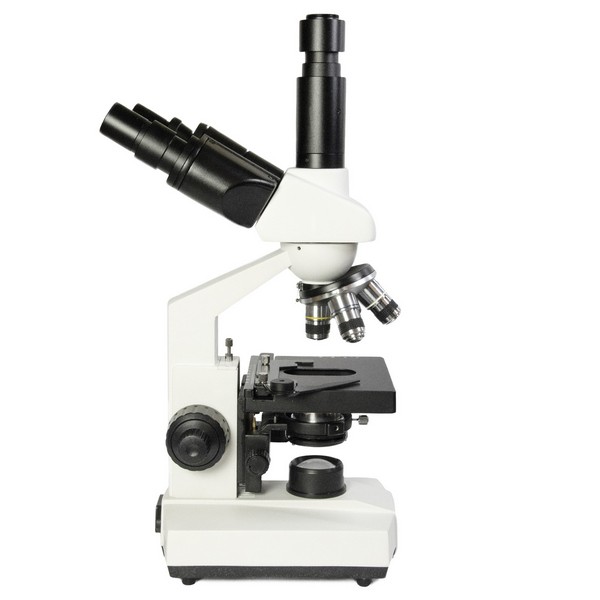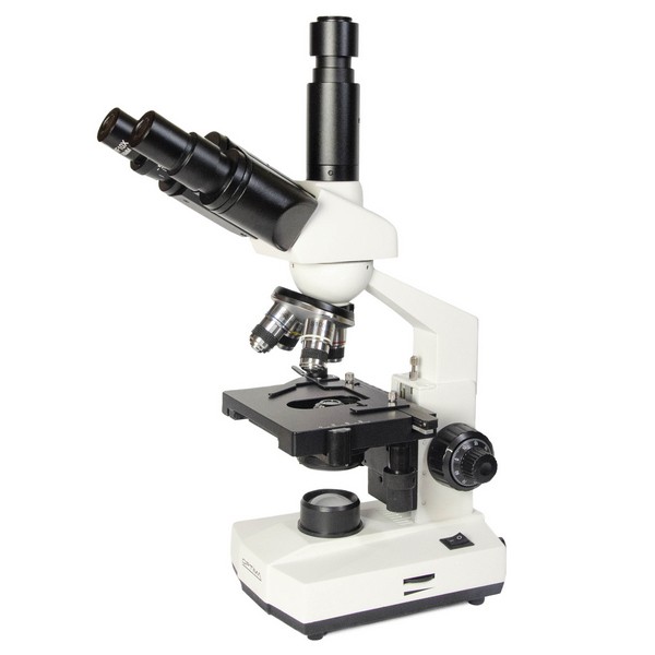 Корпус микроскопа выполнен из металла, что придает не только надежность конструкции, но и, благодаря увеличению веса и резиновым опорным ножкам, обеспечивает большую стабильность прибора и гашение микровибраций. Тринокулярная насадка с адаптером для цифровых камер C-mount незаменима для длительных рутинных наблюдений, так как способствует меньшей утомляемости глаз. Она наклонена под углом 30°, плавно поворачивается на 360°, позволяя проводить наблюдения в любом удобном положении, а также работать с микроскопом ряду наблюдателей без перемещения микроскопа в пространстве.