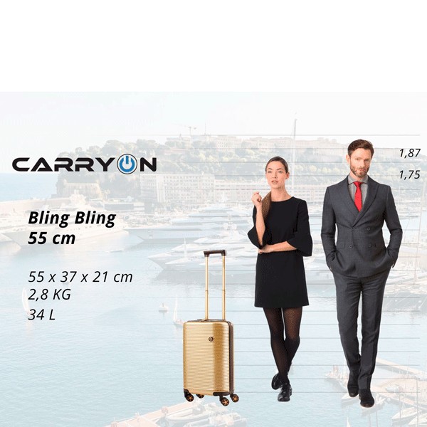 Колекція Bling Bling бренду CarryOn поєднує у собі найкращі матеріали з модним дизайном. Глянцева поверхня валізи захоплює своїм блиском та красою. Корпус валізи виконаний із високоміцного, комбінованого матеріалу - полікарбонату (PС) та ABS-пластику.