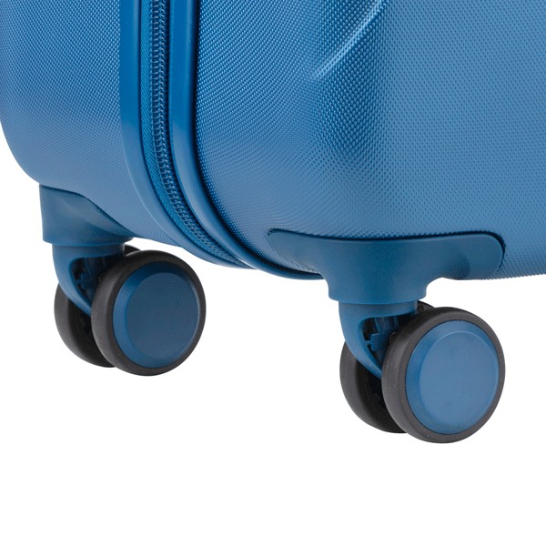 Валіза оснащена чотирма повноповоротними спареними колесами з можливістю незалежного розвороту кожного колеса на 360°. Системою передбачено рівномірний перерозподіл навантаження на кожне колесо, що у свою чергу сприяє плавному коченню та маневреності валізи, докладаючи при цьому мінімум зусиль. Колеса виготовлені із високотемпературного термопластичного поліуретану (TPU). Матеріал має міцність порівнянну з пластиком, гнучкістю силікону, а також має підвищену стійкість до перепадів температур. Відмінною особливістю коліс із TPU матеріалу є зниження шуму до мінімуму при коченні валізи по нерівній поверхні. Завдяки стійкості до стирання матеріал коліс відрізняється тривалим терміном експлуатації.