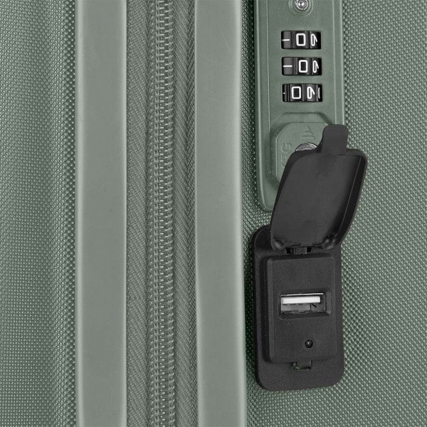 Колекція сучасних валіз Gabol Vermont виконана за останніми тенденціями моди з використанням технічних новинок. Вбудований USB-порт дозволить Вашому телефону завжди бути зарядженим, а корпус виготовлений із міцного та довговічного ABS-пластику, він збереже Ваші комплекти речей в ідеальному стані. Внутрішній об'єм розділений перегородкою на два відділення та має ремені для фіксації речей усередині. Валіза обладнана фірмовим кодовим замком з функцією митного огляду TSA. Валіза легка, маневрена і зручна для транспортування.
