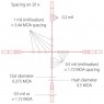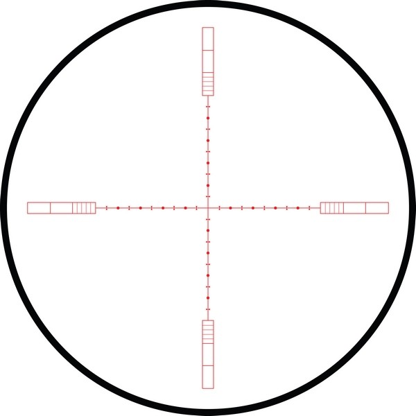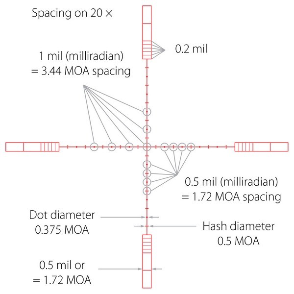 20х 1/2 Mil Dot IR - удобная универсальная сетка для максимально точного прицеливания на различных расстояниях. Главное отличие от обычной прицельной марки Mil Dot состоит в том, что тут имеются дополнительные пересечения, отмечающие пол мила. Все компоненты этой сетки имеют строго регламентированные размеры, расстояния между всеми элементами также регламентированы. Благодаря этому не проблема определить расстояние до цели либо размеры цели, приняв при этом правильную поправку на ветер и определить траекторию падения пули. Данный 1/2 Mil Dot верен при 20-кратном увеличении. Для других увеличений линейные и угловые размеры определяются методом интерполяции, либо по специальным таблицам. Персональную адаптацию сетки под конкретное оружие и тип снаряда позволит совершить бесплатный баллистический калькулятор.