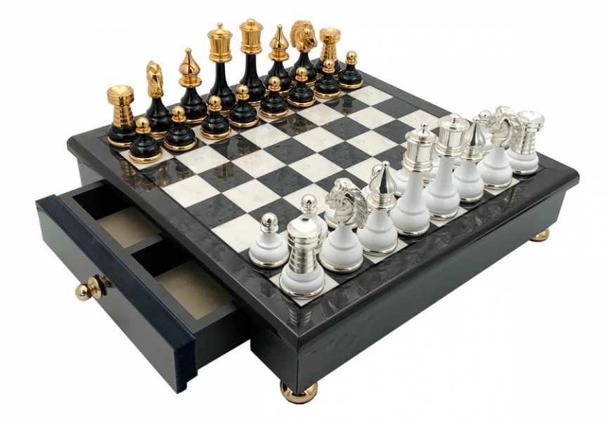 Шахи всесвітньо відомого італійського бренду Italfama. Дошка виготовлена з дерева, покрита лаком у кілька шарів. Розмір дошки: 32 x 32 cm, розмір квадрата: 3,5 cm. Фігурки колекції Staunton виготовлені з латуні + золото 24К та срібло 925 проби.