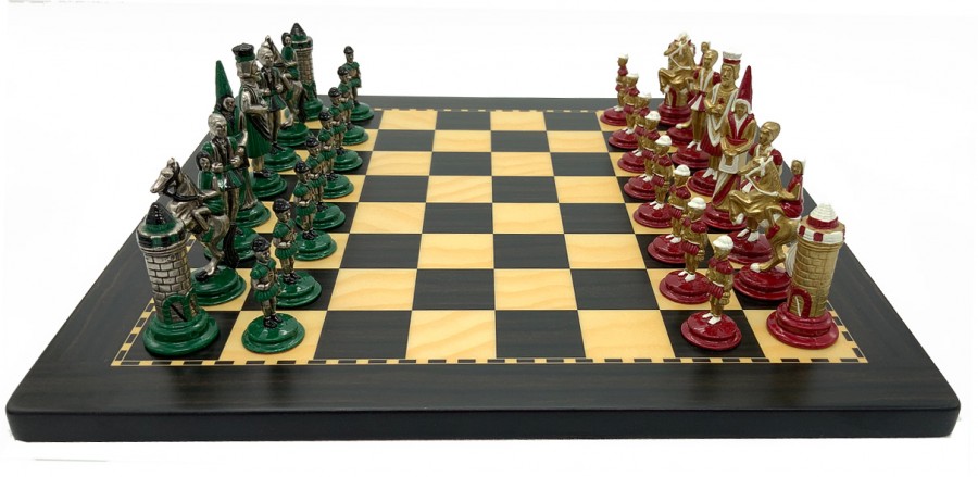Шахи всесвітньо відомого італійського бренду Italfama. Дошка виготовлена із дерева. Розмір дошки: 30 x 30 x 1,3 cm, розмір квадрата: 3,0 cm. Фігурки колекції Medioevale виготовлені з цинку, латуні та нікелю.