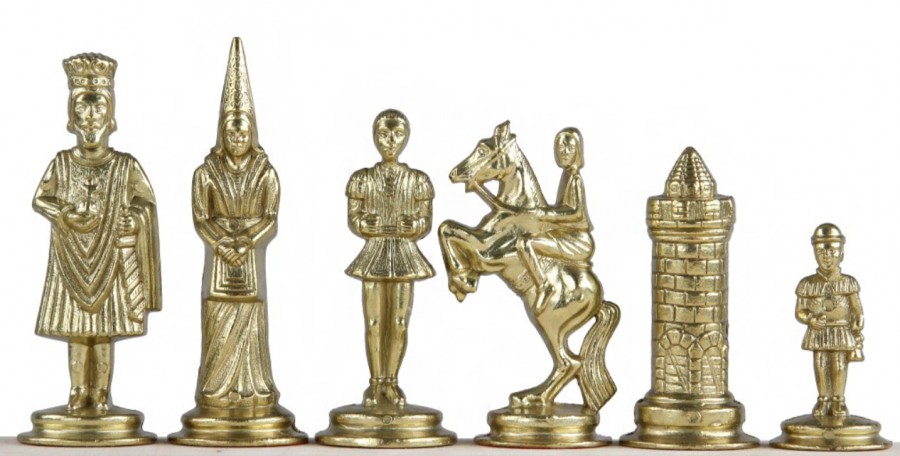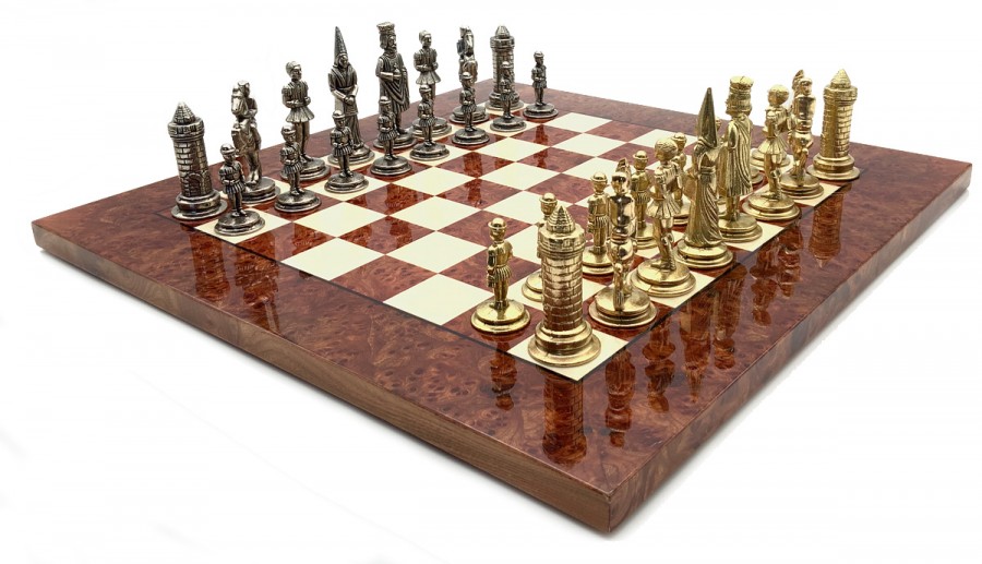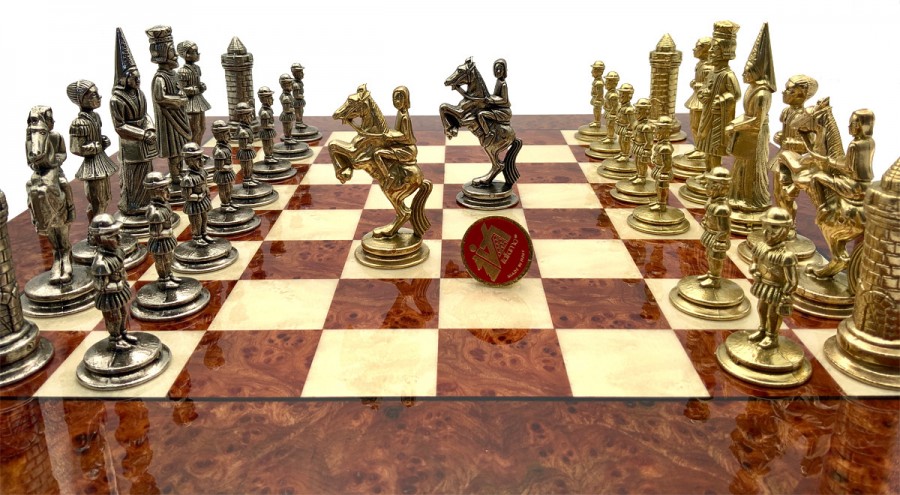 Шахи всесвітньо відомого італійського бренду Italfama. Дошка виготовлена із дерева. Розмір дошки: 42 x 42 x 1,8 cm, розмір квадрата: 4 cm. Фігурки колекції Camelot Medio виготовлені із цинку, латуні, нікелю.