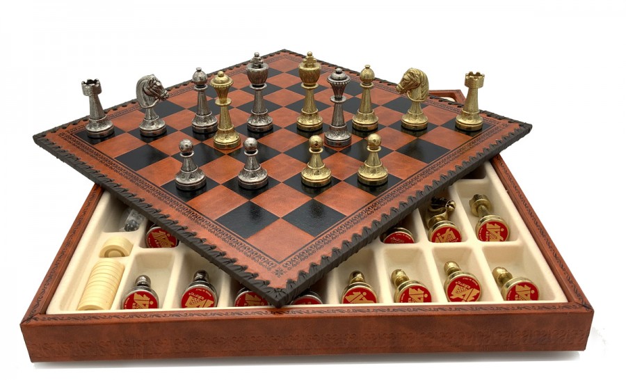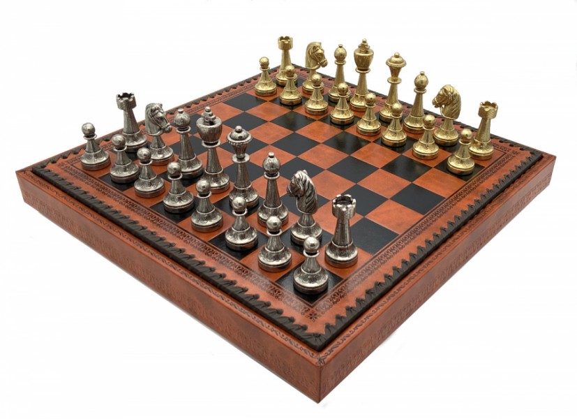 Шахи всесвітньо відомого італійського бренду Italfama. Дошка виготовлена з екошкіри. Розмір дошки: 35 x 35 x 3,5 cm, розмір квадрата: 2,8 cm. Фігурки колекції Staunton виготовлені із цинку, латуні, нікелю.