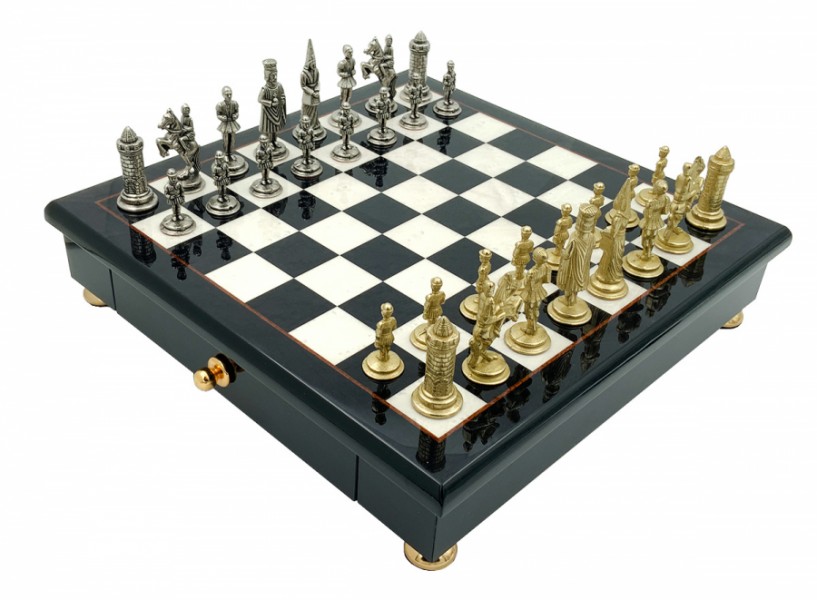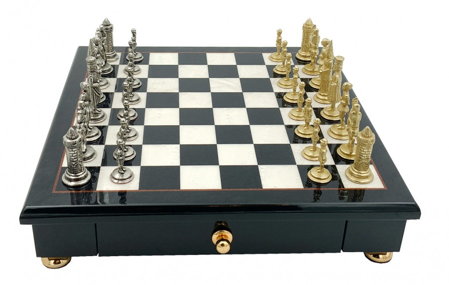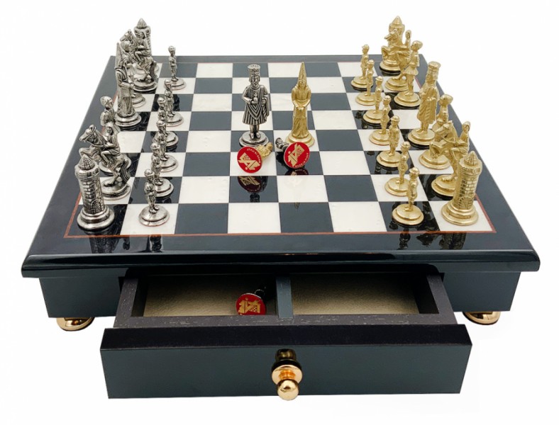 Шахи всесвітньо відомого італійського бренду Italfama. Дошка виготовлена з дерева, покрита лаком у кілька шарів. Розмір дошки: 32 x 32 cm, розмір квадрата: 3,5 cm. Фігурки колекції Camelot Piccolo виготовлені із цинку, латуні, нікелю.