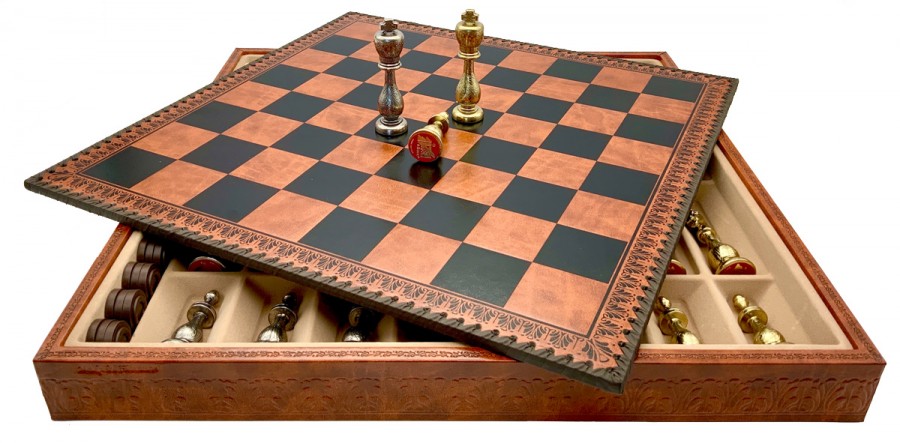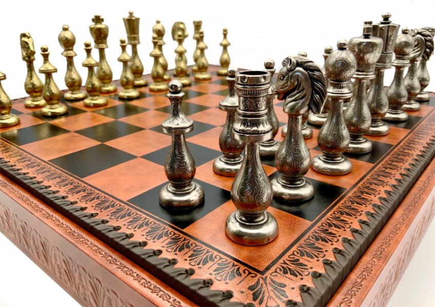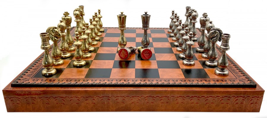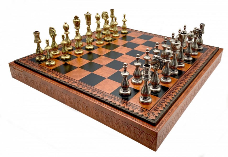 Шахи всесвітньо відомого італійського бренду Italfama. Дошка виготовлена з екошкіри. Розмір дошки: 48 x 48 x 5,5 cm, розмір квадрата: 5,2 cm. Фігурки виготовлені з латуні та нікелевого покриття.