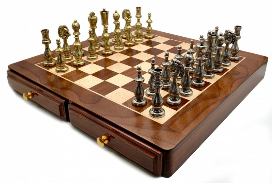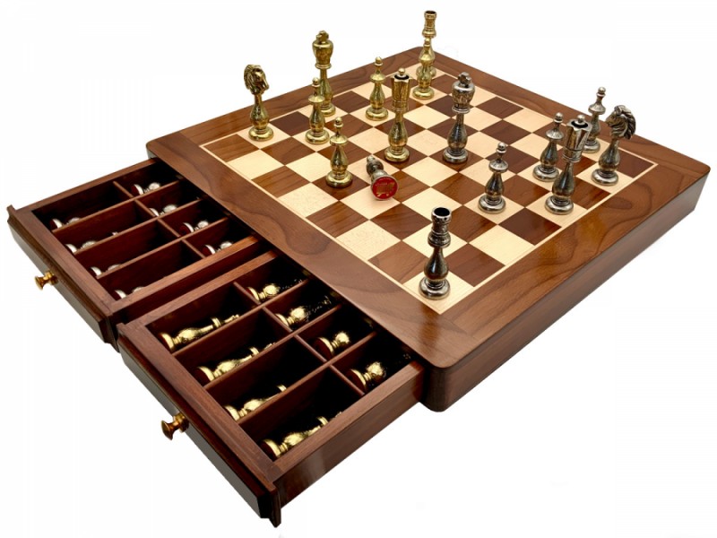 Шахи всесвітньо відомого італійського бренду Italfama. Дошка виготовлена з дерева з висувним шухлядком для зберігання фігурок. Розмір дошки: 46 x 46 x 6 cm, розмір квадрата: 4,5 cm. Фігурки виготовлені з латуні та нікелевого покриття.