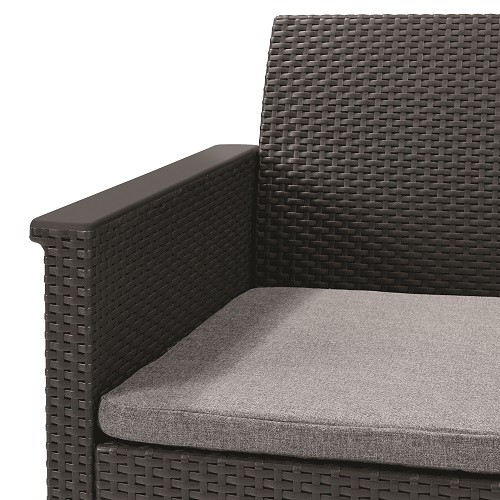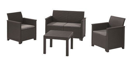Emma ідеально підходить для створення затишного місця для відпочинку на свіжому повітрі. З його допомогою Ви можете облаштувати сад вашої мрії або терасу, навіть якщо у вас немає великого простору. У комплект входять 2 крісла, 2-місний диван та класичний столик. Текстура ротанга та гладкі підлокітники, а також різальна стільниця підкреслюють унікальний характер комплекту. Комплект можна легко чистити. Дуже простий МОНТАЖ З СИСТЕМИ "JUST CLICK AND GO":