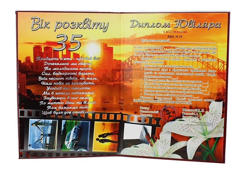 Диплом Ювіляру 35 – чудовим доповненням до основного подарунка може стати подарунковий диплом на честь Ювілею. Цей диплом двосторонній, він у вигляді книги. На першій половинці диплома чудові вірші про ювілей. А друга половина диплома підтверджує, що ювіляр закінчив школу «мудрості та досвіду». Також там перераховані всі переваги ювіляра.
