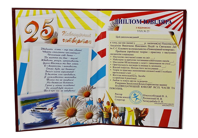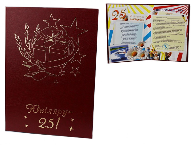 Диплом Ювіляру 25 – чудовим доповненням до основного подарунка може стати подарунковий диплом на честь Ювілею. Цей диплом двосторонній, він у вигляді книги. На першій половинці диплому чудові вірші про ювілей 25 років. А друга половина диплома підтверджує, що ювіляр закінчив школу «мудрості та досвіду». Також там перераховані всі переваги ювіляра. Розмір 15*21 см
