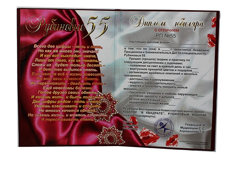 Диплом Юбиляру 55 - отличным дополнением к основному подарку может стать подарочный диплом в честь Юбилея. Данный диплом двусторонний, он в виде книжки. На первой половинки диплома прекрасные стихи про юбилей 55 лет. А вторая половина диплома подтверждает, что юбиляр закончил школу «мудрости и опыта». Так же там перечислены все достоинства юбиляра. Размер 15*21 см