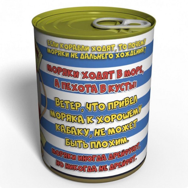 Что может быть лучше, чем пара свежих носков? Верно, консервированные носки самого крутого моряка! Получать подарки - всегда приятно, а делать их - вдвойне приятнее, ведь эмоции радости и счастья, которыми светится лицо вашего собеседника - бесценны. Если в вашем окружении есть моряк, то непременно подарите ему такой прикольный, недорогой подарок, который запомнится надолго!