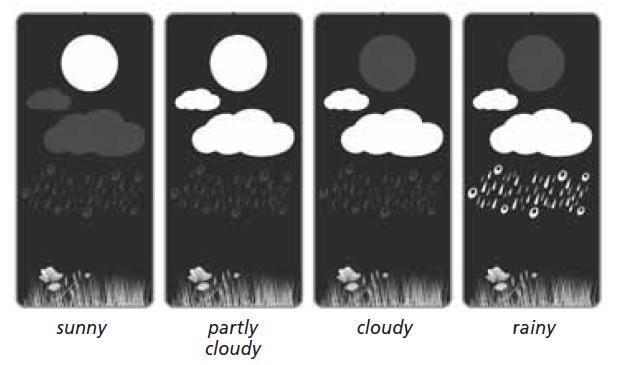 Прогноз анімований. 4 різні кольорові піктограми погоди: (сонячно, мінлива хмарність, хмарність, дощ). Піктограма Сонця також з'являється і вночі, якщо зіркова ніч
