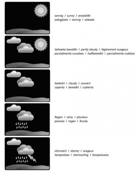 Прогноз анімований. 5 різних кольорових піктограм погоди: (сонячно, хмарно, хмарно, дощ і буря). Піктограма Сонця також з'являється і вночі, якщо зіркова ніч