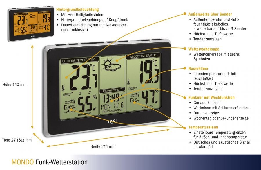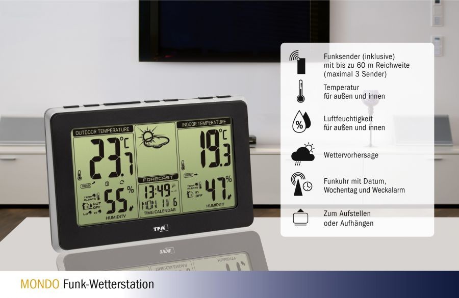 Яка погода на вулиці? Достатньо поглянути на метеостанцію MONDO, і ви одразу побачите картину. Сонце, хмари або краплі дощу - на основі змін атмосферного тиску символи погоди дають вам прогноз на майбутню погоду, і ви знаєте, чи збираєтеся ви сьогодні їхати на велосипеді, чи волієте їхати на машині.