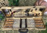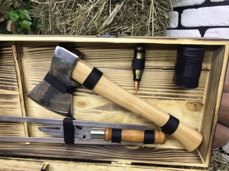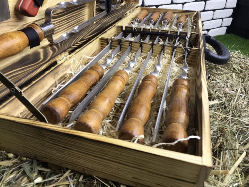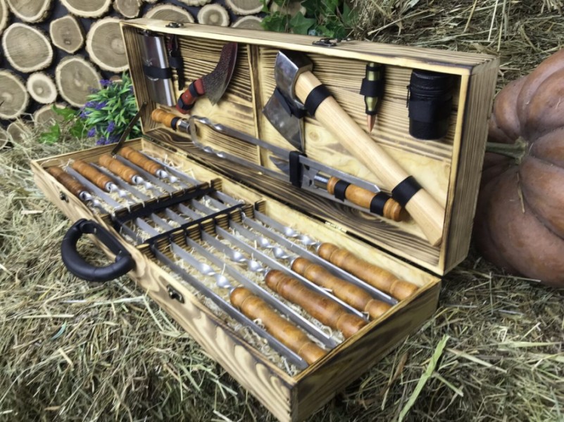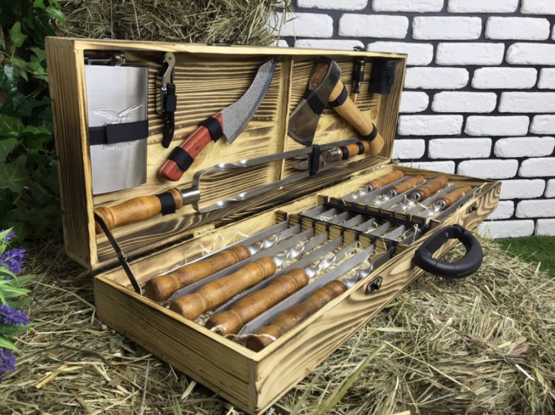 Комплексний набір в який входить все для приготування шашлику: 8 шампурів, ніж узбецький "пчак", топірець туристичний, подвійний шампур для курки, стейка та реберця, вилка для зняття м'яса, барний ніж, набір чарок, фляга, газова запальничка.
