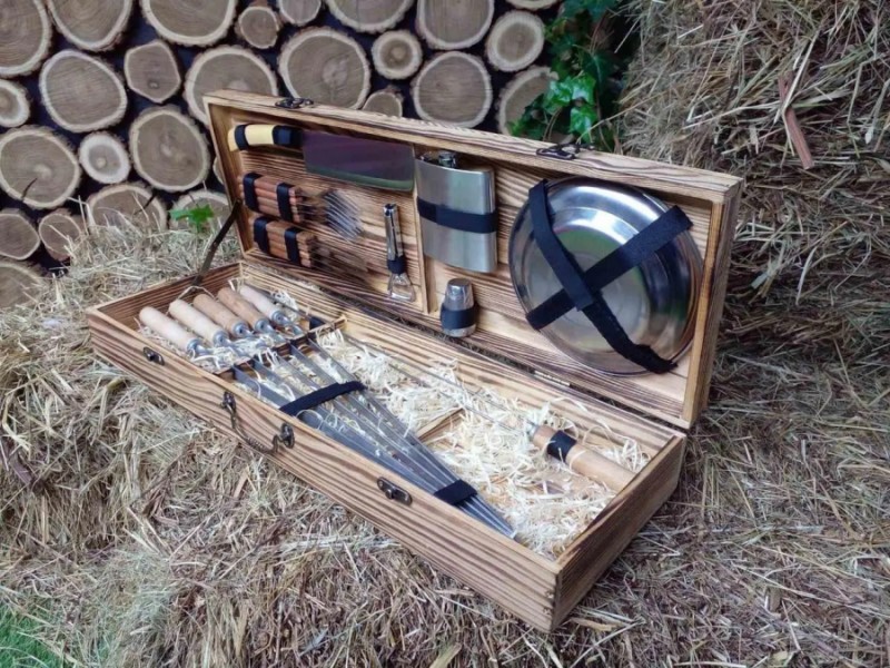 Комплексний набір в який входить все для приготування шашлику: 6 шампурів, ніж м'ясника сікач, подвійний шампур для овочів, 4 тарілки, 4 вилки. 4 ножі, фляга, 4 стоси, штопор