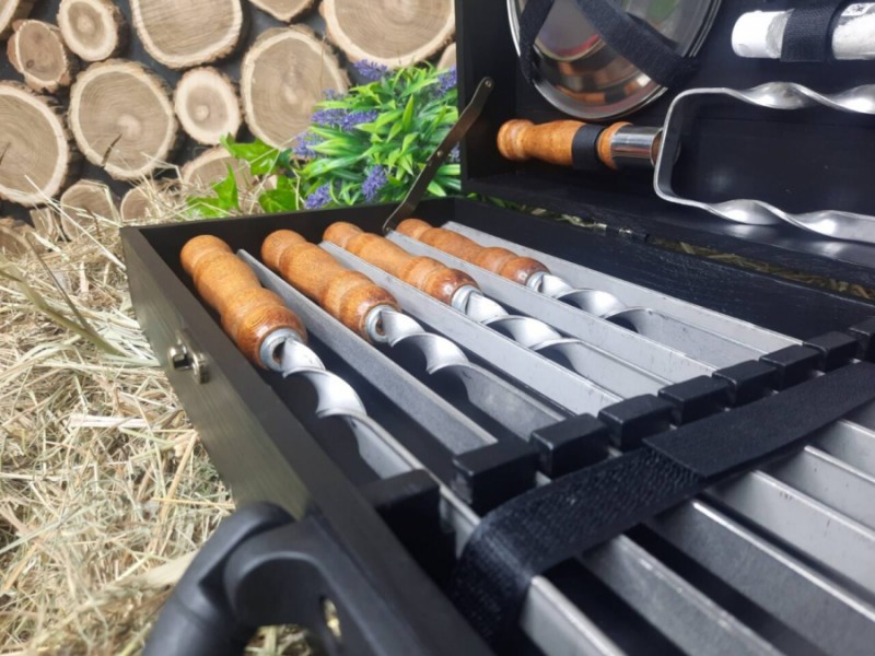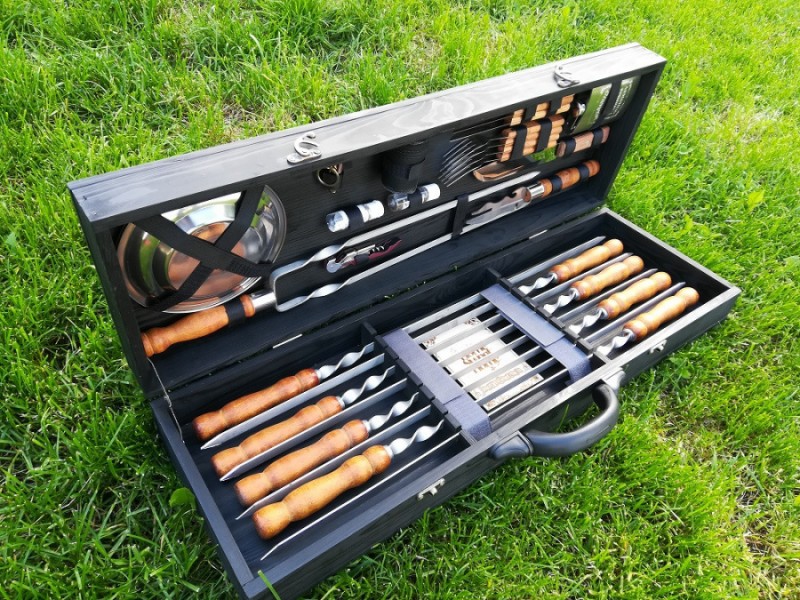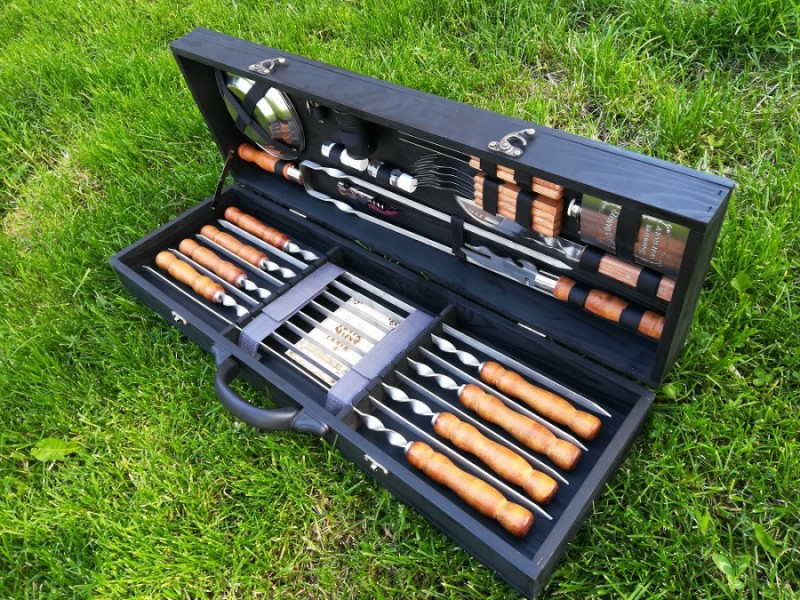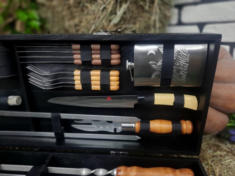 Комплексний набір в який входить все для приготування шашлику: 8 шампурів, ніж серії Tramontina Barbecue, вилка для зняття м'яса, барний ніж, набір з 4 чарок, фляга, газова запальничка, 4 тарілки, 4 вилки, 4 ножі для стейка, набір для спецій .