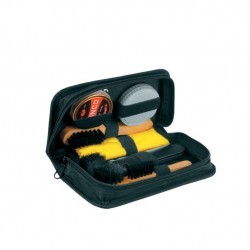 Стильний футляр із висококласного шкірозамінника з набором усіх необхідних аксесуарів для догляду за взуттям. Орієнтовний подарунок чоловікові, особливо якщо йому доводиться багато часу проводити в поїздках або на природі. Набір для чищення взуття. До його складу входять всі необхідні предмети: щітки, крем та лопатка.