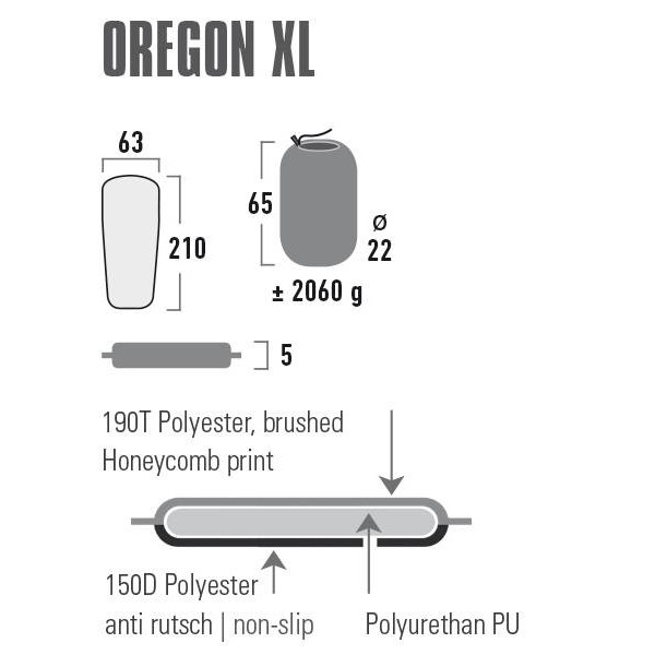 High Peak Oregon XL - туристичний килимок, що самонадувається, товщиною 5 см, з наповнювачем з поліуретанової піни високої щільності, що забезпечує чудову ізоляцію і комфорт під час сну. Верх з перфорацією Wave Cut ідеально прилягає до тіла та сприяє легкому складання. Форма трапеції відрізняється простотою використання та економією ваги. Верх килимка виготовлений з високоякісної, ковзної та приємної для шкіри матової тканини з поліестеру 190T зі стильним принтом у вигляді сот, а низ - з міцного нековзного поліестеру 150D. High Peak Oregon XL має високоякісний клапан, який миттєво всмоктує повітря, заповнюючи піну для швидкого використання. При складанні повітря виходить швидше, що значно полегшує згортання. Килимок поставляється з двома компресійними ременями та чохлом для зберігання.