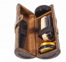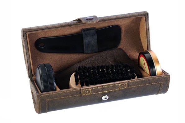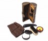 Корисний подарунок для чоловіка, який завжди хоче виглядати на найвищому рівні. Набір для догляду за взуттям у шкіряному циліндричному футлярі коричневого кольору, в комплект входить щітка, лопатка, крем для взуття, губка та ганчірочка.