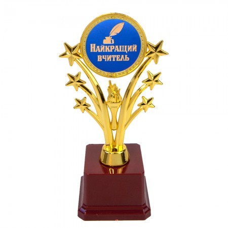 Відмінна та оригінальна нагорода, її можна вручити та нагородити вчителі, подарувати класному керівнику. Подарунок символічний і незвичайний, який говорить як дорогий для Вас вітається! Статуетка виконана у вигляді 3D композиції зірок та медалі, усередині якої напис українською мовою. Фігурка виконана золотим кольором на класичному бордовому п'єдесталі. Статуетка упаковується в індивідуальний тубус з прозорого пластику.