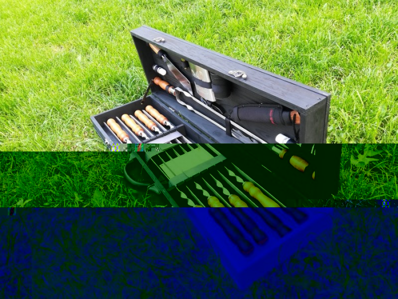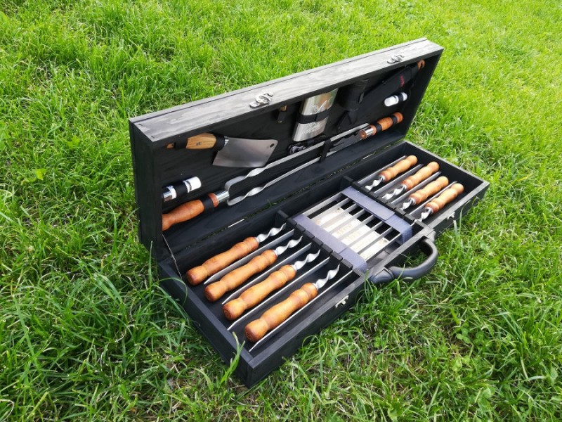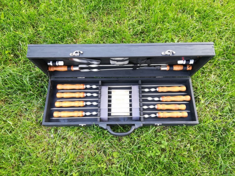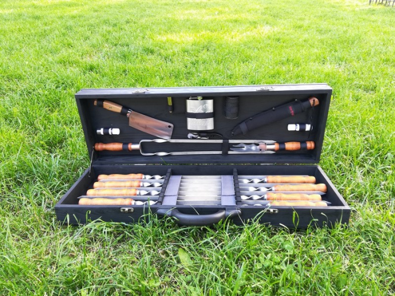 У наборі 8 шампурів, фляга з нержавіючої сталі, вилка для зняття м'яса, мисливський ніж, 4 чарки, ніж для овочів, барний ніж, подвійний шампур для стейка, реберців і курки, запальничка газова.