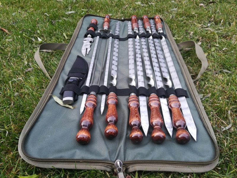 Набір із 7 шампурів для шашлику та люля-кебаб плюс набір додаткових аксесуарів у Super чохлі ручної роботи чудово підійде на подарунок будь-якому цінителю смаження м'яса!