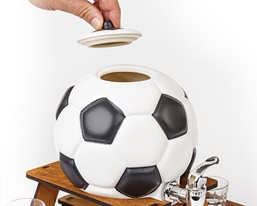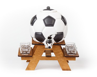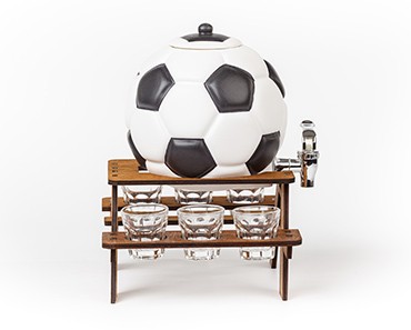 Оригінальний подарунок футбольному фанату. У наборі підставка, 6 чарок та керамічна бочка у вигляді футбольного м'яча зі зручним краником для розливу.