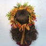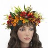 Український осінній вінок виконаний зі штучного осіннього кленового листя та ягід калини, зелених гілочок та декорований травинками. Український вінок із квітів і стане чудовим доповненням українського образу для фотосесії. Незважаючи на об'ємність, дуже легкий. Виготовлений на міцній основі (каркасі з дроту діаметром 17см), тому добре тримає форму, розмір регулюється за допомогою атласної стрічки ззаду. Фіксація - атласна стрічка, яка вишукано звисає по волоссю, додаючи особливого шарму.