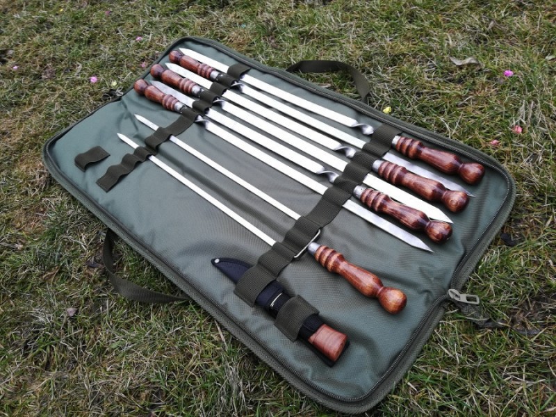 Набір із 6 шампурів для шашлику та люля-кебаб плюс мисливський ніж у Super чохлі ручної роботи чудово підійде на подарунок будь-якому цінителю смаження м'яса!