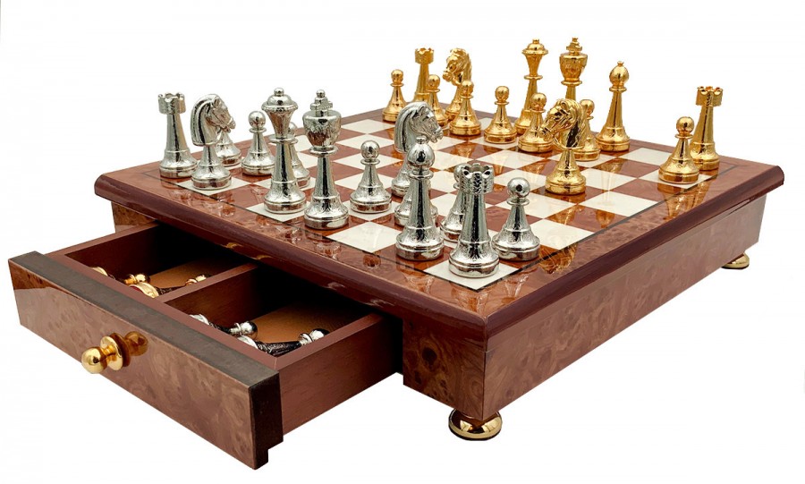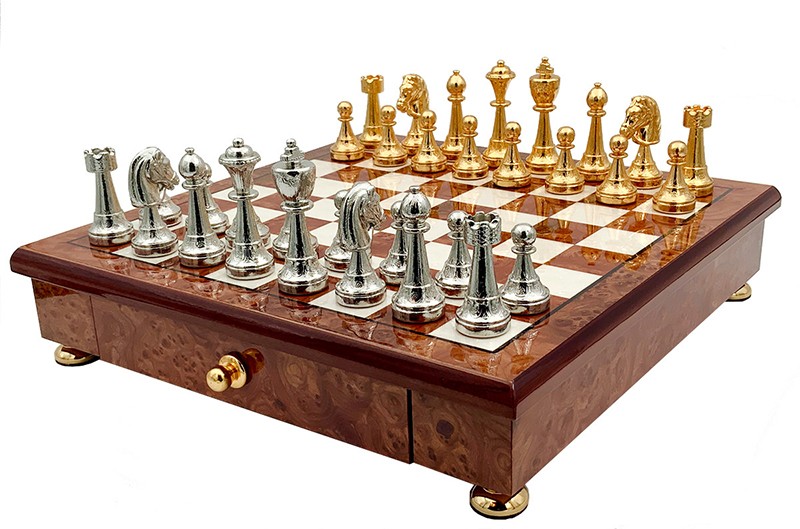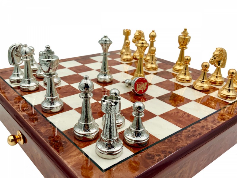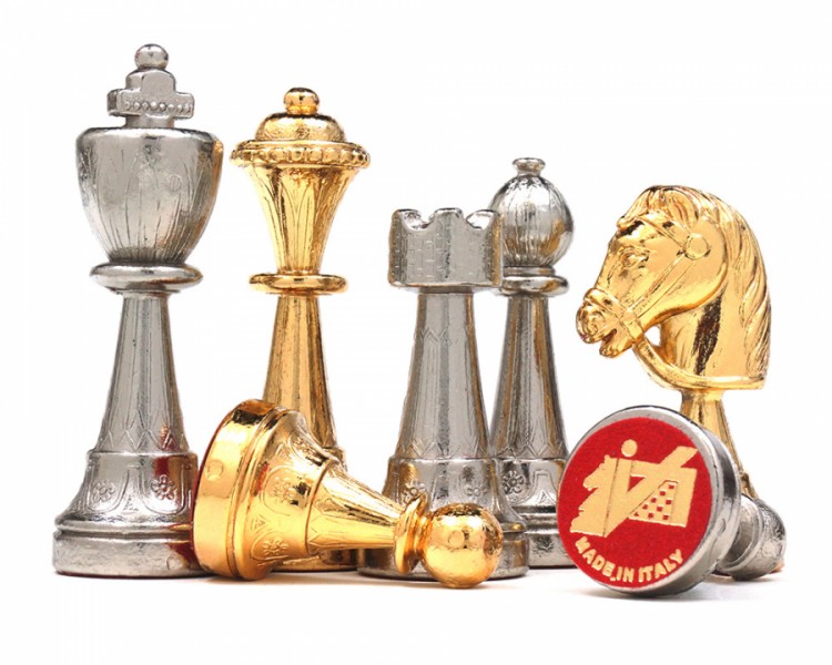 Шахи всесвітньо відомого італійського бренду Italfama. Дошка виготовлена із дерева. Розмір дошки: 33 x 33 см, розмір квадрата: 4,0 cm. Фігурки колекції Staunton виготовлені з цинку + позолота 24К та срібло 925 проби. Розмір короля: 7,5 cm - Ø base 2,5