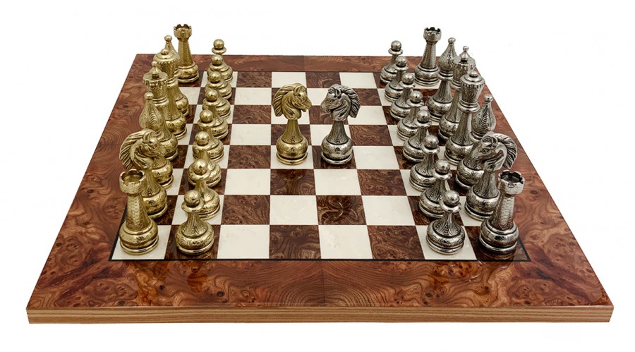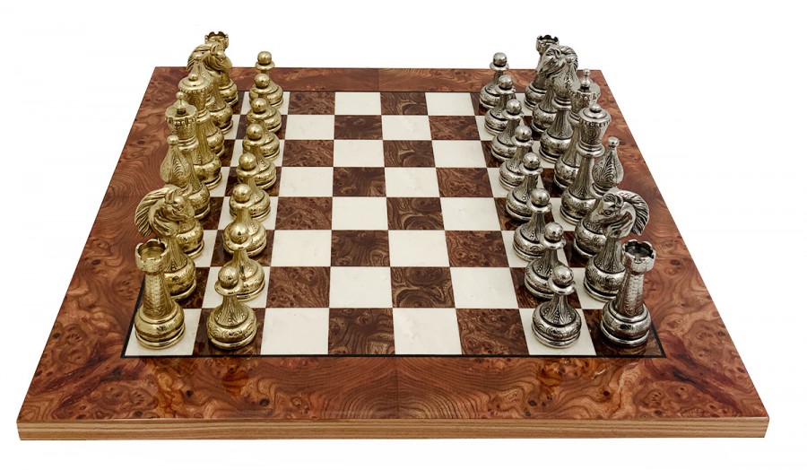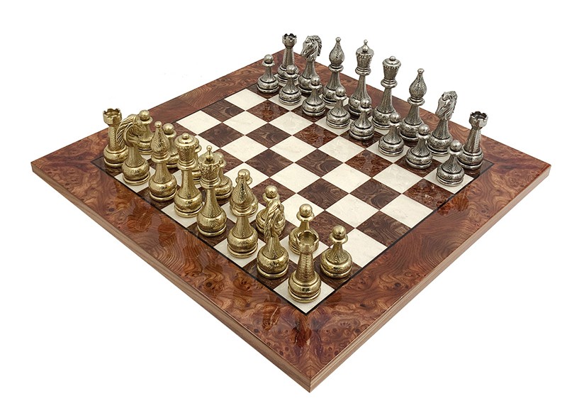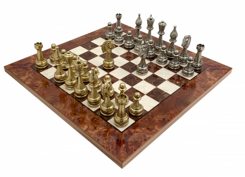Шахи всесвітньо відомого італійського бренду Italfama. Дошка виготовлена із дерева. Розмір дошки: 42 x 42 x 1,8 cm, розмір квадрата: 4,0 cm. Фігурки виготовлені з цинку, латуні, нікелю. Розмір короля: 10 см, діаметр 3 см.