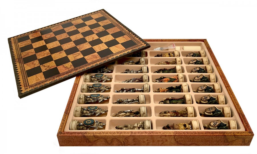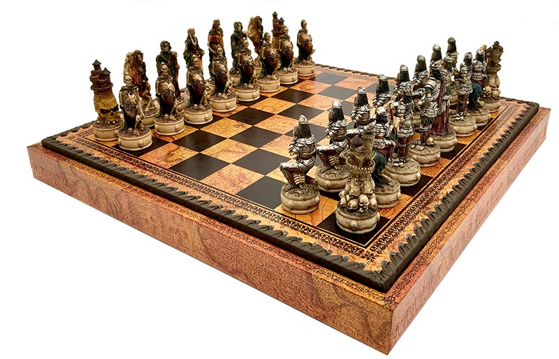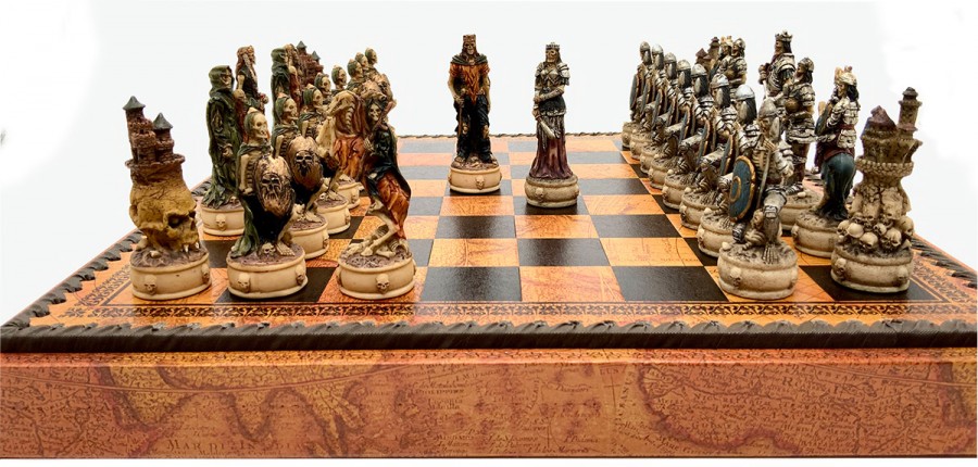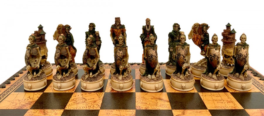 Шахи всесвітньо відомого італійського бренду Italfama. Дошка виготовлена з екошкіри. Розмір дошки: 35 x 35 x 4 cm, розмір квадрата: 3,5 cm. Фігурки колекції "Skeletons" виготовлені з полістоуну. Розмір короля: 8 см. У комплекті йдуть шашки, нарди.