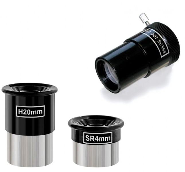 Комплектація Труба: алюміній (зовнішня обробка: карбонове волокно) Тренога: алюмінієва з предметним столиком для аксесуарів Монтування: азимутальна AZ-1 Окуляри: SR 4 мм (1.25''), H 20 мм (1.25'') Лінза Барлоу: 2 Місячний фільтр Адаптер для смартфона (планшета) Програмне забезпечення Stellarium