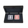 Скринька виготовлена з дерева, внутрішнє оздоблення велюр, що надає їй неповторної елегантності. Усередині коробки знаходяться дві колоди гральних карт із пластиковим покриттям темно-синього та червоного кольорів.