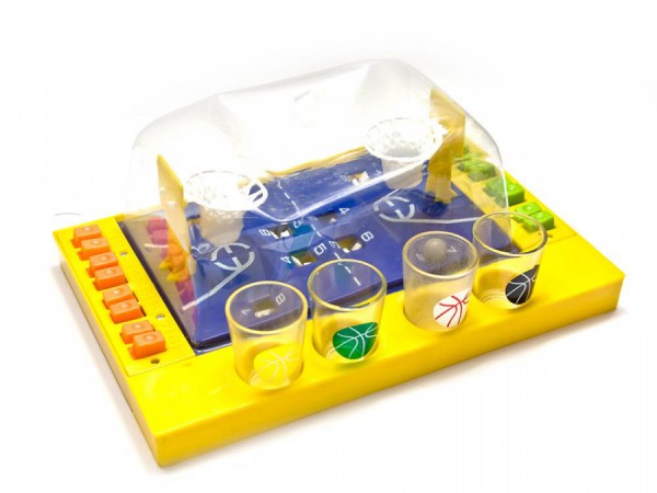 Реальна гра в баскетбол – подібні були в минулому столітті, в ігрових автоматах, хто пам'ятає. А в комплекті – 4 різнокольорові чарки – хто кому м'яч закине, з того й пляшка!