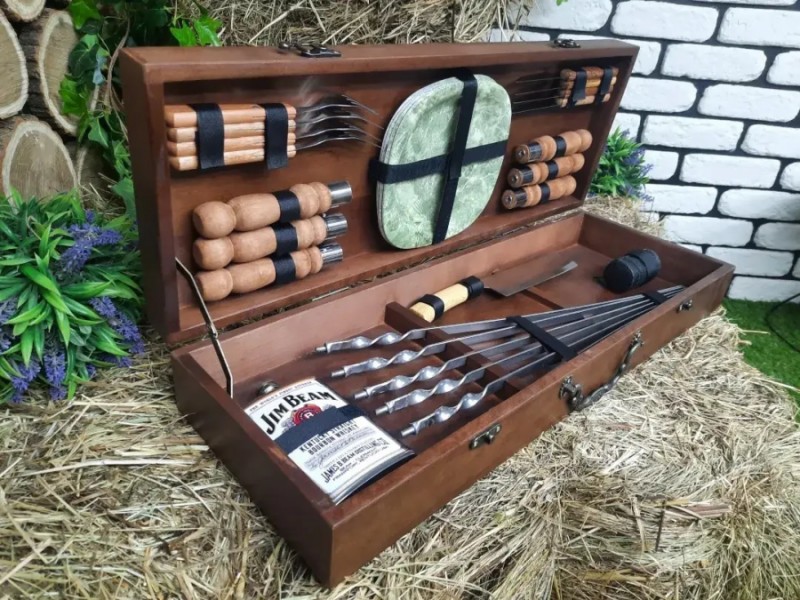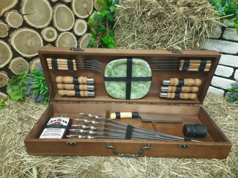Комплексний набір, в який входить все для приготування шашлику: 6 шампурів, набір з 4 чарок, фляга, ніж з широким лезом, 4 вилки та 4 ножі та 4 тарілки з якісного пластику.