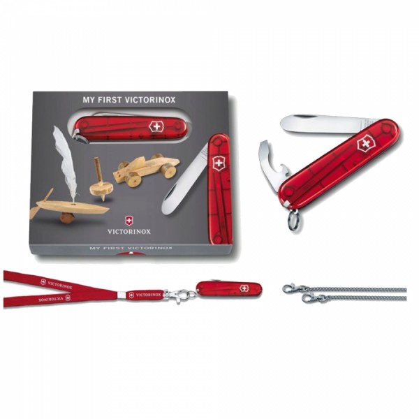 Дитячий швейцарський ніж Victorinox My First, У комплекті з цим ножем поставляється ланцюжок, шнур-підвіс та ефектна подарункова упаковка.