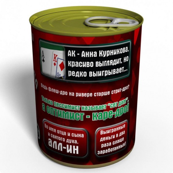Покер - одна з найпоширеніших ігор карт у світі. І якщо у вас є покерист, то ви можете порадувати його незвичайним подарунком, який ми зробили саме для гравців у покер - Консервовані Шкарпетки І Картоплі Професіонала PokerStars. У свою чергу, Покерстарс є лідером серед організаторів покерних турнірів та онлайн ігор, і практично кожен гравець знає чи грав у pokerstars.