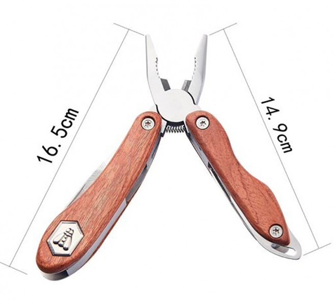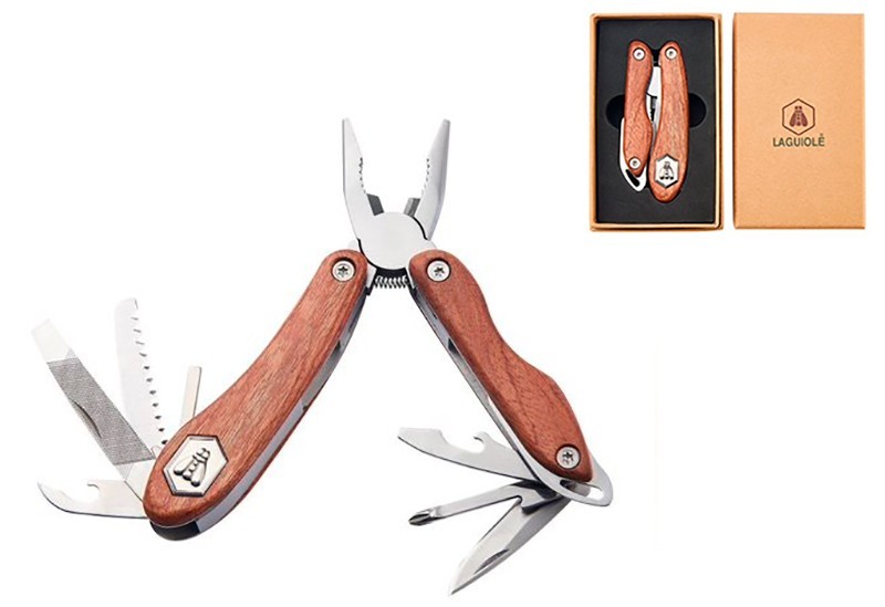 пасатижі, відкривачка для пляшок, пряма викрутка, хрестоподібна викрутка, ніж 5 см, консервний ніж, пилка по дереву, пилка по металу, кабельний різак, отвір для темляка. Накладки ергономічної рукояті мультитулу виготовлені з натурального дерева палісандр, з металевим вкрапленням всесвітньо відомої бджілки – логотипом бренду LAGUIOLE.