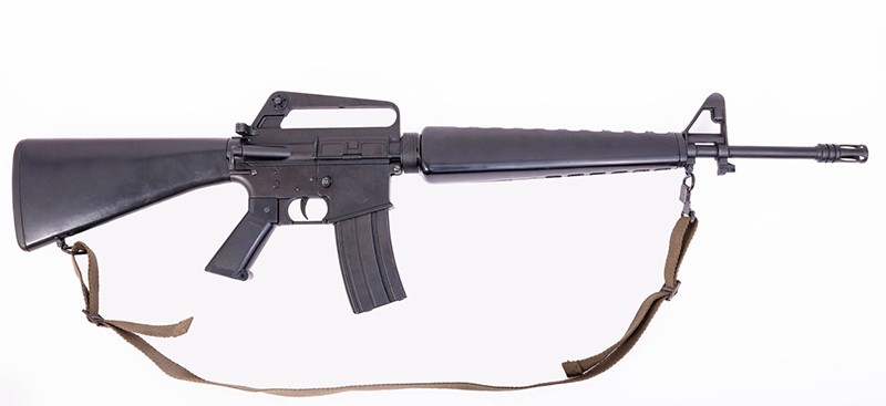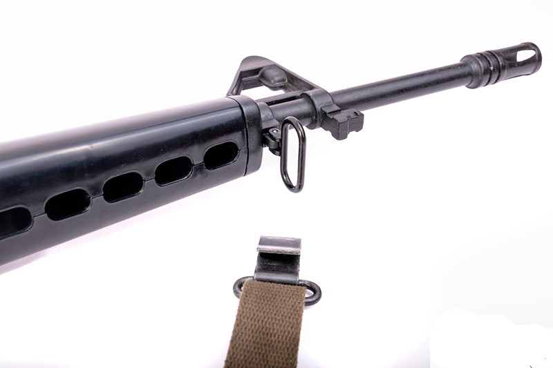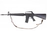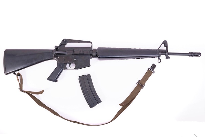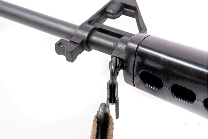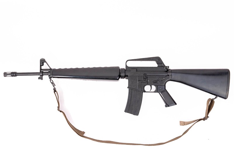 Репродукція штурмової гвинтівки, виготовлена з металу та пластику, з тканинним поясом, з імітованим механізмом заряджання та стрільби та зі знімним магазином.Штурмова гвинтівка M16 була розроблена Юджином Стоунером у 1950-х роках з оригінальною назвою AR-15. Виготовлена зі сталі, алюмінію та різних пластикових деталей, це автоматична штурмова гвинтівка з газовим і поворотним затвором, що приводиться в дію знімними обоймами на 20 і 30 патронів калібру 5,56 мм. Він стріляє зі швидкістю 800-900 пострілів в хвилину і ефективної дальністю стрільби 500 м.Вона була прийнята на озброєння армії Сполучених Штатів і використовувалася для операцій у в'єтнамській війні в 1963 році. У 1967 році після деяких модифікацій M16 була перейменована в M16A1, ставши стандартною гвинтівкою збройних сил США в 1969 році.Відбулася війна у В'єтнамі між 1955 і 1975 роками, щоб запобігти возз'єднанню В'єтнаму під комуністичним урядом. Республіка В'єтнам (Південний В'єтнам) брала участь за підтримки Сполучених Штатів та інших країн проти місцевих партизанів Національного фронту звільнення В'єтнаму (В'єтконг) і армії Демократичної Республіки В'єтнам (Північний В'єтнам) , підтриманий Китаєм і Радянським Союзом.З часів війни у В'єтнамі сімейство гвинтівок М16 було основною зброєю збройних сил США. M16 була широко озброєна арміями в усьому світі, і загальне виробництво гвинтівок M16 з початку її розробки становить приблизно 8 мільйонів одиниць, що є найбільш виробленою зброєю свого калібру.
