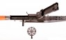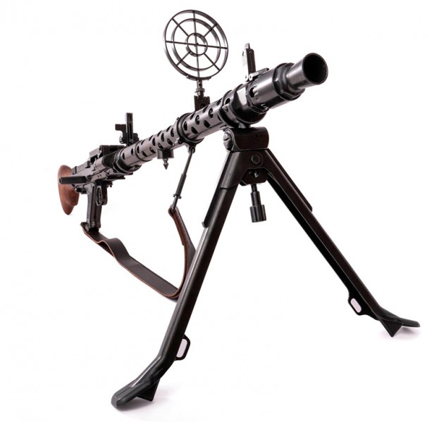 Імітація кулемета, виготовлена з металу, дерева та пластику, з імітацією заряджання та стрільби, мобільною сошкою та шкіряним ременем.
