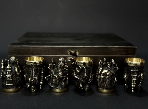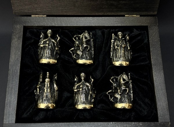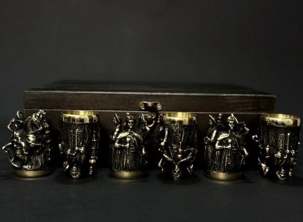 1. Чарки 6 шт: художнє лиття з бронзи, у середині покриті харчовим булатом. Висота 70 мм, ширина 40 мм, об’ем 30 мл, вага 200 грам.