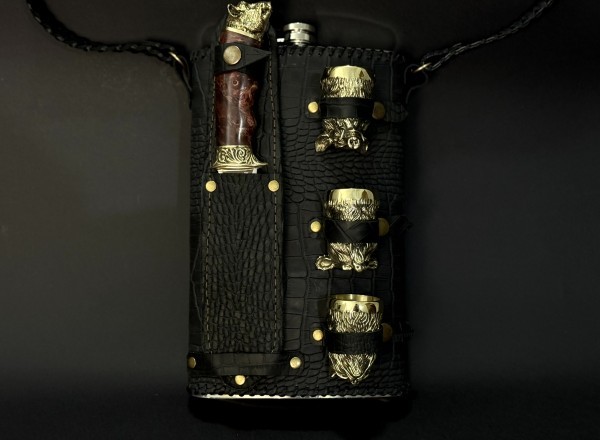3. Фляга: нержавіюча сталь - обшита натуральною шкірою (рептілія), об'єм фляги 1800 мл